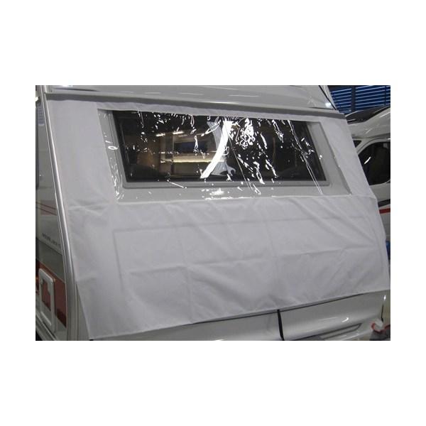 GoCamp suojapeite vaunun etuosaan. Asennetaan markiisikiskoon etuikkunan yläpuolella. Suojaa vaunua sekä kesä- että talvisäilytyksessä. Estää kaasukaapin luukun jäätymisen kiinni.